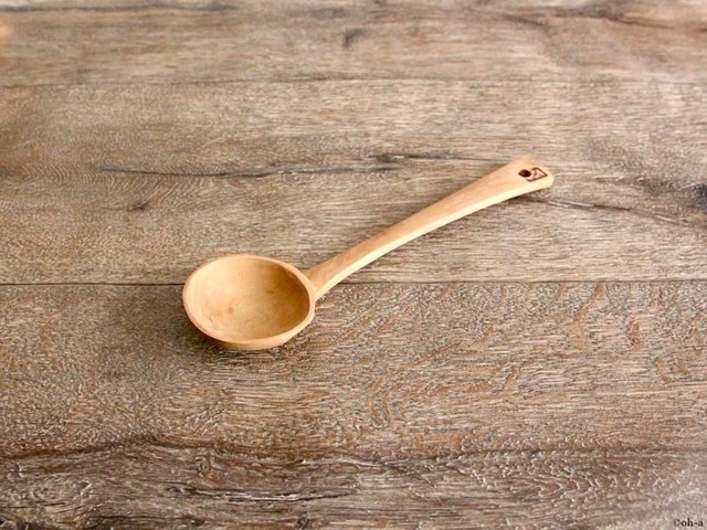 広島の中心地から離れた安芸太田町は、町の面積の9割が森林で古くから良質な木材の産地として、宮島細工の原材料にも使われてきたそうです。 この地で戸河内刳物(とごうちくりもの)と呼ばれる工芸品が作られています。 一本の丸太から木片を切りだし、独自のカンナやノミだけで全ての工程を手作業でおこないます。 主にお玉や、スプーンなどを作っています。 お玉は「浮き上げお玉」と呼ばれます。(水に沈まないお玉という意味だそうです) この土地では元旦のあさ、お雑煮のお鍋に浮き上げお玉を浮かべ、一家が幸せに浮上しますよう願ったそうです。 戸河内刳物のはじまりは江戸時代の後期に遡のぼり、1991年には広島県の指定伝統的工芸品となりましが、現在は1軒の工房のみが、ご家族数人だけで技術を引き継いでいる状況です。 そんな希少な工芸品からは自然のぬくもりと、カンナやノミで作業した力強さと、手仕事ならではのおだやかな温かみが感じられます。 木製という素材の特性もありますが、洋風のお鍋に使っても違和感なく絵になり、土物だけでなく琺瑯や金属製のおを傷つけず、安心して使えるという実用面での有用性も備えています。 白木のお玉からは3サイズをセレクト致しました。 白木お玉(中)24cmは二人鍋くらいのサイズの取り分け用にちょうどいいかと思います。 白木お玉(小)21cmは一人から二人分のお鍋の取り分け用にちょうどいいかと思います。 白木お玉(豆)18cmはひとりで取り分けとレンゲとして使うサイズ。ラーメンやうどんなどにも便利にお使いいただけます。 おことわり 手作業のためスペックに誤差があります また、木製品のため木の節目のある部分が残ります アバウトで申し訳ありませんが、入荷や製造時期のタイミングにより柄に穴があったりなかったりします。現在庫では中サイズのお玉と半穴お玉が穴なしとなります。 ご使用後はお湯か水で洗い柔らかい布で水分を拭き取ってください たわしや研磨剤は使用しないでください 食洗機、食器乾燥機はお避けください サイズ:全長180×柄の長さ130×お玉の部分の径50mm×高さ25mm 素材:サクラ材 生産国:日本 制作:横畠工芸 この商品単品でのご購入は宅配便コンパクトでの出荷となります 運賃目安重量は26gです 運賃設定についての詳細は https://tompolotable.theshop.jp/p/00004 をご覧ください