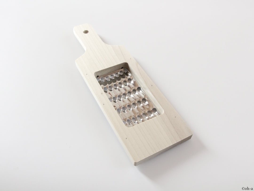 木製のスライサーって珍しいですけど、手にした時のあたりがやわらかくていいなと思いました。素材はホウの木です。水キレが良いのでまな板やすりこぎなどにもよく使われます。