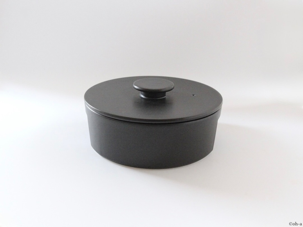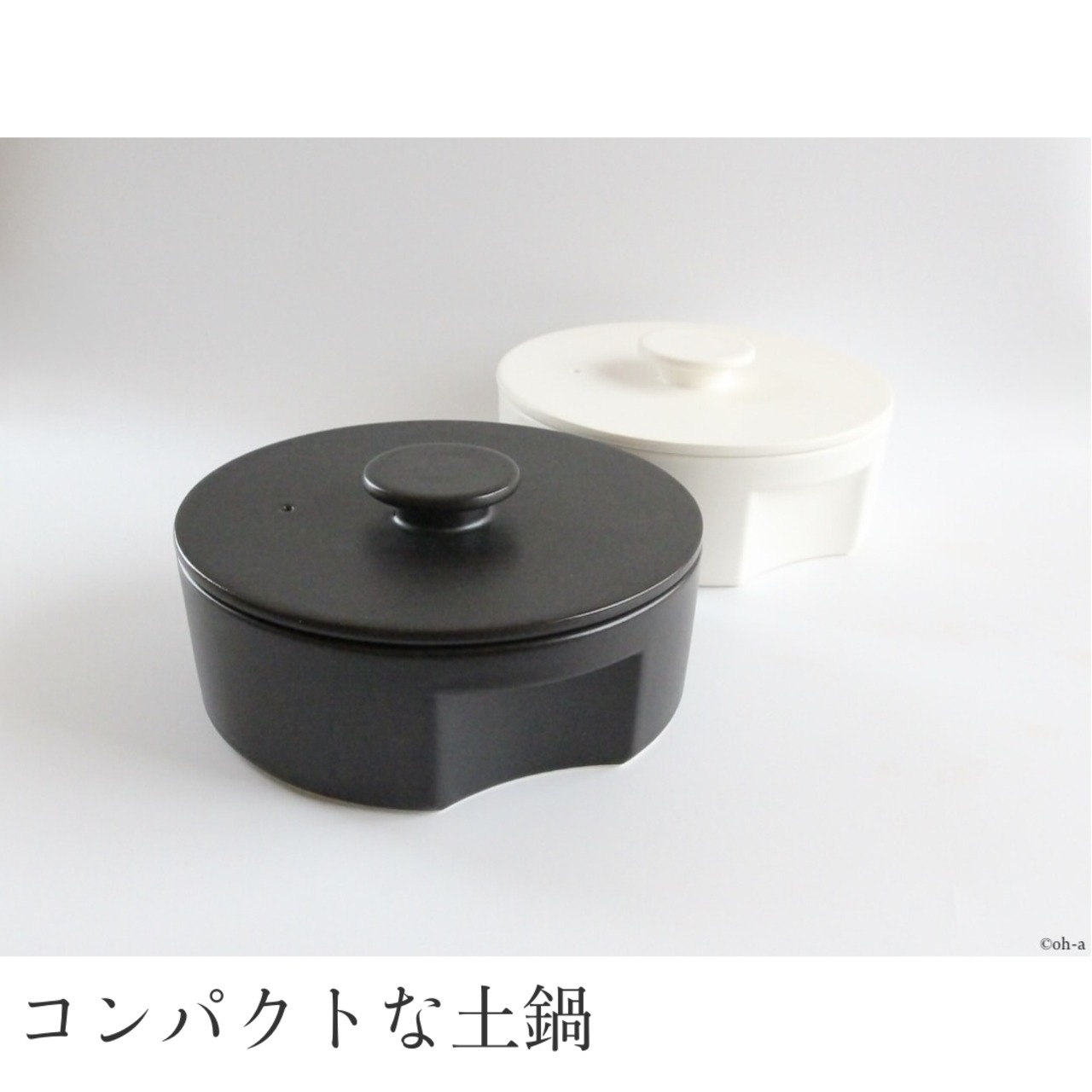 土鍋の取手を取り払い、内側に窪ませ持ち柄とすることで、すっきりとした平らな円筒形にしたシンプルなフォルムの土鍋です。