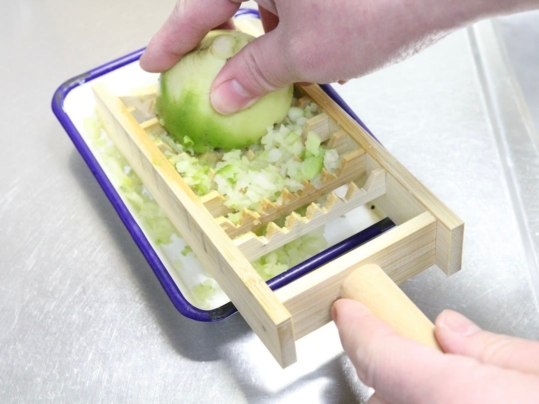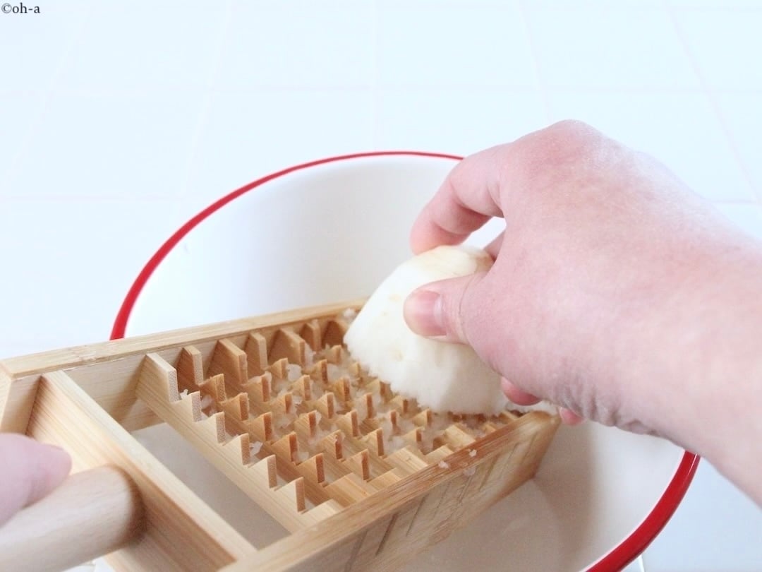 鬼おろしは手前に引いて卸します。回しながら卸すと大根が斜めにならず均等に下ろせます。