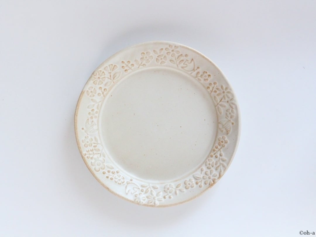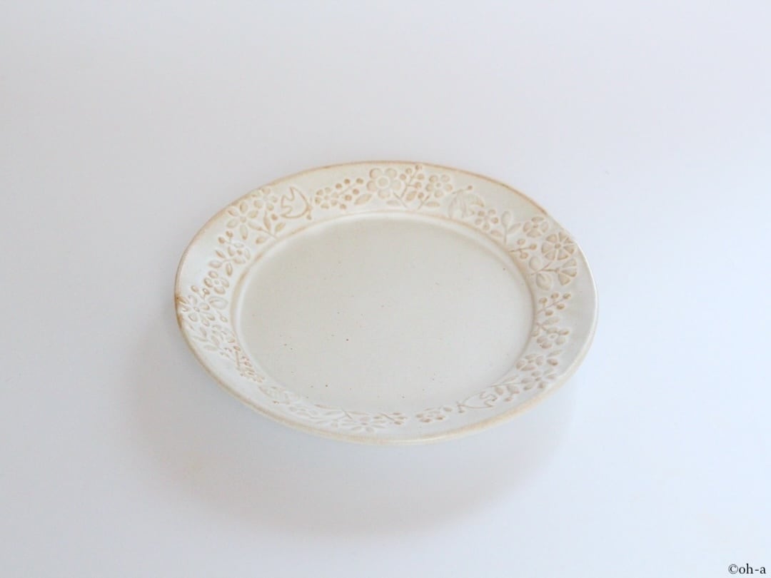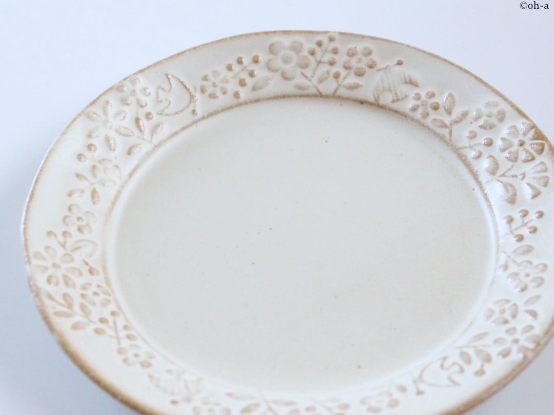 生成りの静かな色合いがにぎやかな意匠に落ち着きをもたらしている飽きのこないプレートです。