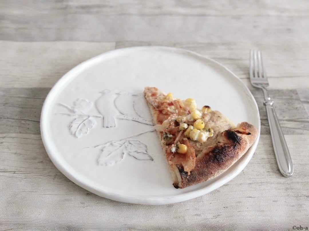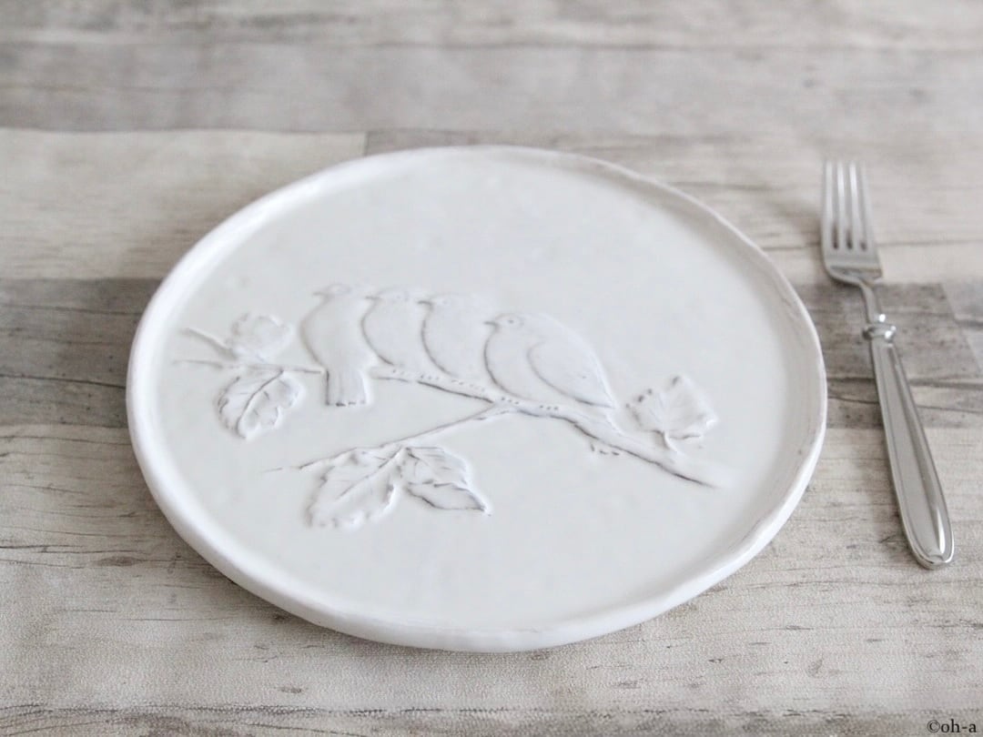 小枝に4羽の鳥が仲良く肩を寄せ合っている姿が愛くるしいプレートは、どこか日本画の風情を感じさせます。