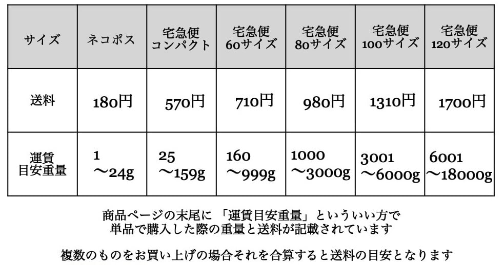 複数のお品物をご購入の際、上の表で購入前の商品の重量を計算する事でカゴに入れる前に総額の送料が類推できます。